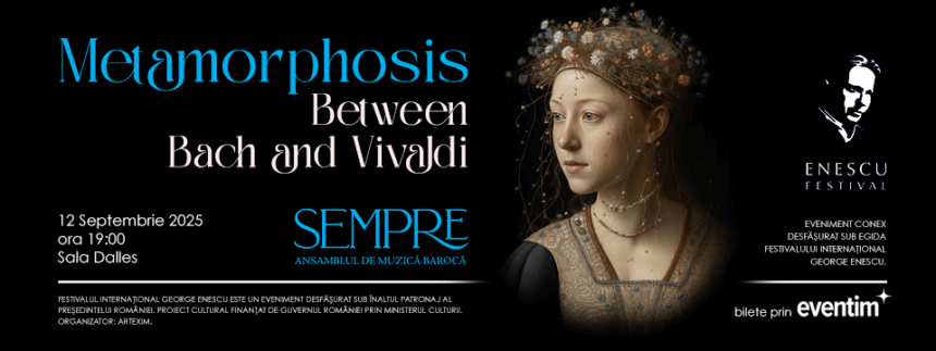 Pe 12 septembrie 2025, de la ora 19:00, Sala Dalles din București găzduiește concertul „METAMORPHOSIS – Between Bach and Vivaldi”, cel mai nou proiect al ansamblului de muzică barocă SEMPRE. Evenimentul face parte din programul conex al Festivalului Internațional George Enescu 2025 și aduce în prim-plan metamorfoza muzicală în Barocul european.