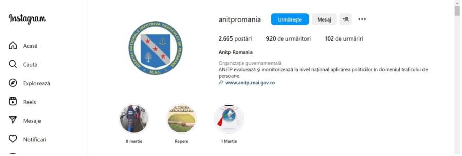 Contul de Instagram al ANITP are 920 de urmăritori și 120 de urmăriri, „performanță” pe care o bate și un copil, fără să plătească vreo campanie de promovare.