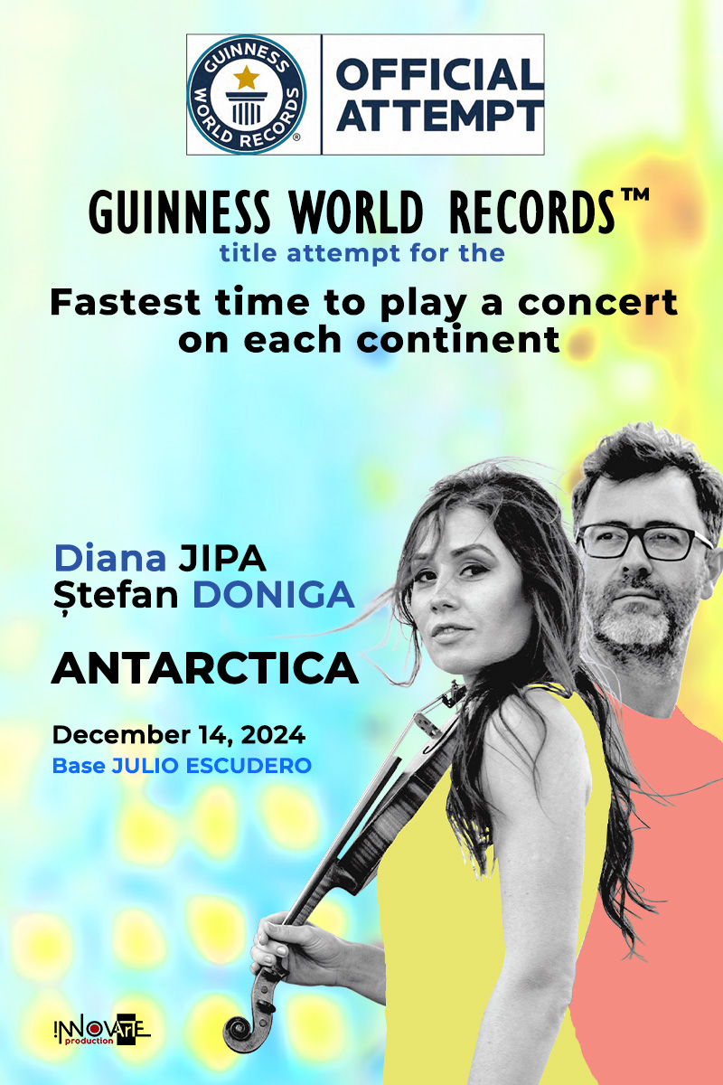 Violonista Diana Jipa și pianistul Ștefan Doniga vor susține, pe 14 decembrie, un concert de excepție în Antarctica, devenind astfel primii muzicieni din lume care susțin concerte profesioniste pe toate cele șapte continente într-un interval mai scurt de 100 de zile. Această realizare le va aduce celor doi artiști primul record mondial GUINNESS WORLD RECORDS pentru un proiect muzical profesionist din România.