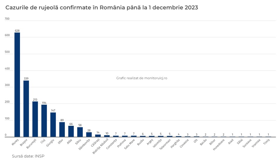 Mai departe, potrivit datelor INSP, vedem că județul Cluj se află în „topul îmbolnăvirilor”, adică printre județele care au înregistrat cele mai multe cazuri de rujeolă în această perioadă. Până la data de 1 decembrie 2023, județul Cluj a înregistrat 194 de cazuri de rujeolă, dintre care doar 6 au fost raportate în săptămâna 24 – 30 noiembrie, titrează Monitorul de Cluj.