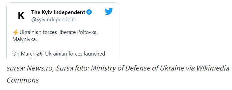 Forţele ucrainene au preluat controlul în două oraşe, Poltava şi Malinikva, din regiunea Zaporojie, relatează Kiev Independent.