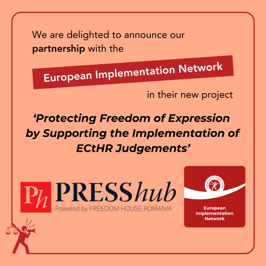 Freedom House România și PRESShub anunță cooperarea cu European Implementation Network (EIN) (Rețeaua europeană de implementare) în cadrul noului lor proiect axat pe protejarea libertății de exprimare în statele membre ale Consiliului Europei.