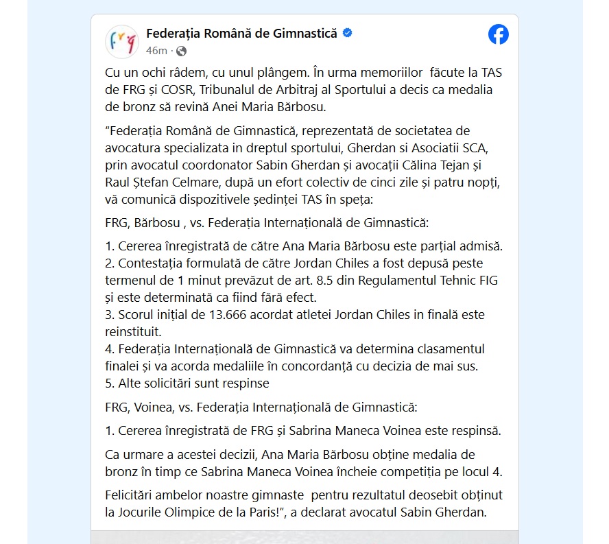„Federația Română de Gimnastică, reprezentată de societatea de avocatura specializata in dreptul sportului, Gherdan si Asociatii SCA, prin avocatul coordonator Sabin Gherdan și avocații Călina Tejan și Raul Ștefan Celmare, după un efort colectiv de cinci zile și patru nopți, vă comunică dispozitivele ședinței TAS în speța: