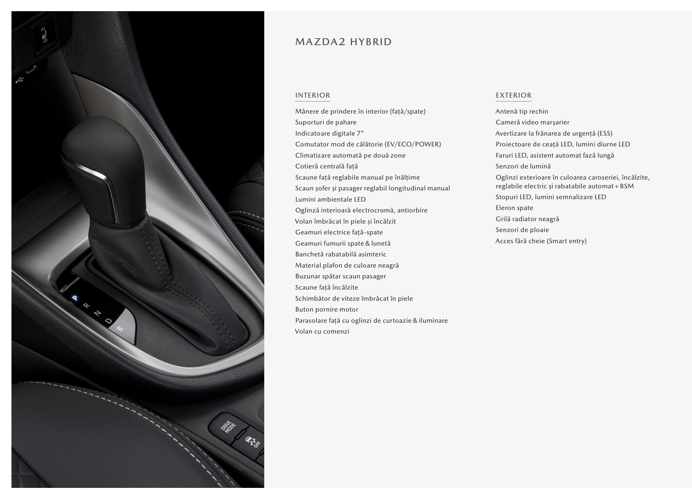 Interiorul Mazda 2 Hybrid surprinde prin calitatea materialelor și atenția la detalii. Deși este o mașină subcompactă, spațiul interior este bine optimizat, oferind confort atât pentru șofer, cât și pentru pasageri. Bordul este dominat de un ecran tactil de 7 sau 9 inch, în funcție de echipare, care asigură accesul la sistemul de infotainment compatibil cu Android Auto și Apple CarPlay. De asemenea, modelul este dotat cu o gamă largă de tehnologii de siguranță, precum asistență la menținerea benzii, frânare automată de urgență și recunoașterea semnelor de circulație.