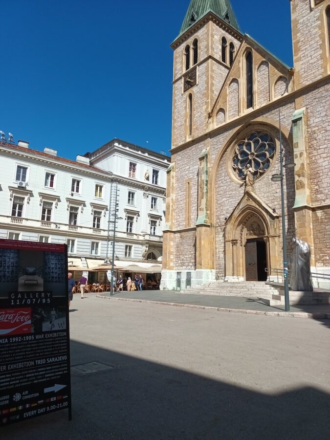 Statuia papei Ioan Paul al II-lea străjuiește intrarea în catedrala catolică, amintind de vizita istorică din 1997. În mica piață din față, se vede urma unui obuz care a lovit pavajul din piatră și s-a împrăștiat în zeci de bucăți. Este vopsită în roșu deschis și multe astfel de semne sunt răspândite prin orașul vechi.