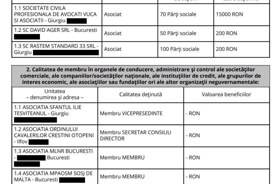 Avocatul Vucă, viitor magistrat este și om de afaceri. Potrivit termene.ro, el deținea în 2022 jumătate din firma SC David Ager SRL din București și 100 părți sociale din SC Rastem Standard 33 din Giurgiu.